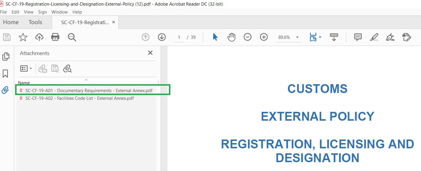 In the SC-CF-19 – Registration, Licensing and Designation Policy is an Annexure document called SC-CF-19-A01 – Documentary Requirements – External Annex.  Open the Policy and click on the Annex opening in the left panel: