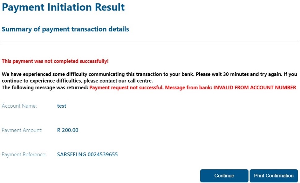 An error message in red will appear should your bank reject the payment instruction, together with the reason why it was rejected by the bank.