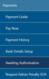 - Select the “Awaiting Authorisation” item under the Payments navigation bar on the left to view all payments that have not been processed yet.