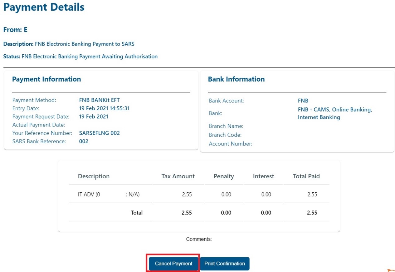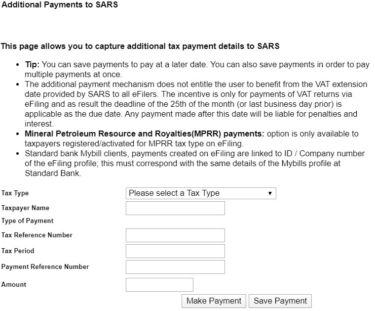 Payments can be initiated after you have submitted a return/declaration or received an assessment that indicates that you must pay SARS.
