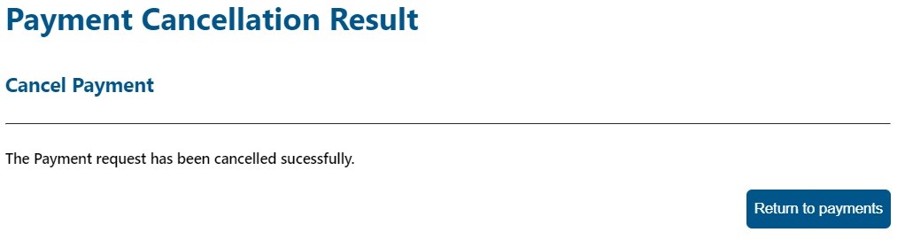 - Once the payment has been cancelled, a message will be displayed to indicate that the payment has been cancelled successfully.