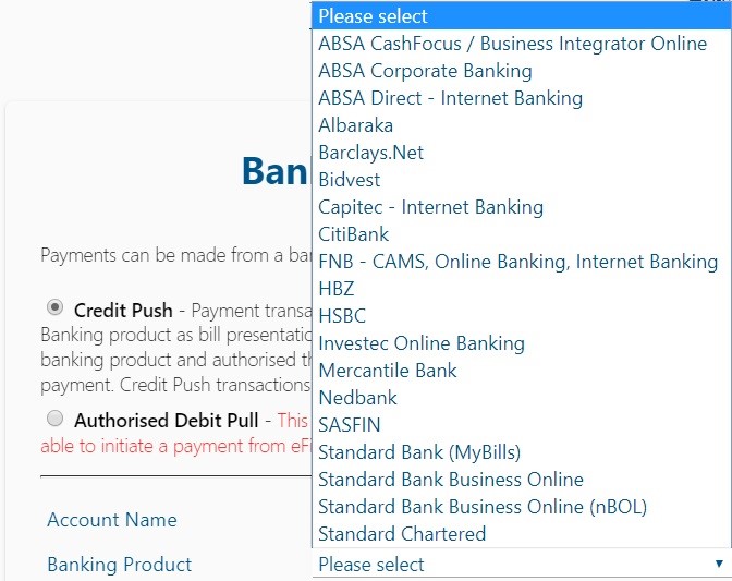 Once you have processed your payment on SARS eFiling, you need to authorise the payment on your bank platform to be released to SARS. Select your banking product from the menu to obtain the required information about the steps you need to follow.