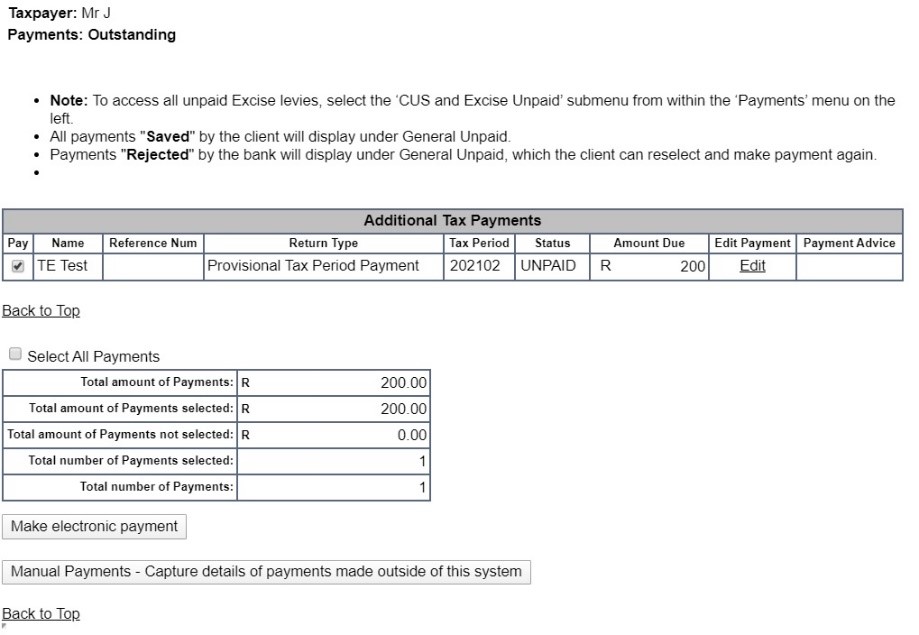 NOTE: When the following message is displayed “This return has been issued to the taxpayer register for eFiling and submitted, but not yet paid via eFiling. Please submit payment from this return via the eFiling website”. This mean you cannot make an additional payment. You need to go back to the return that was submitted and make payment from there by following the steps as indicated “make payment”.