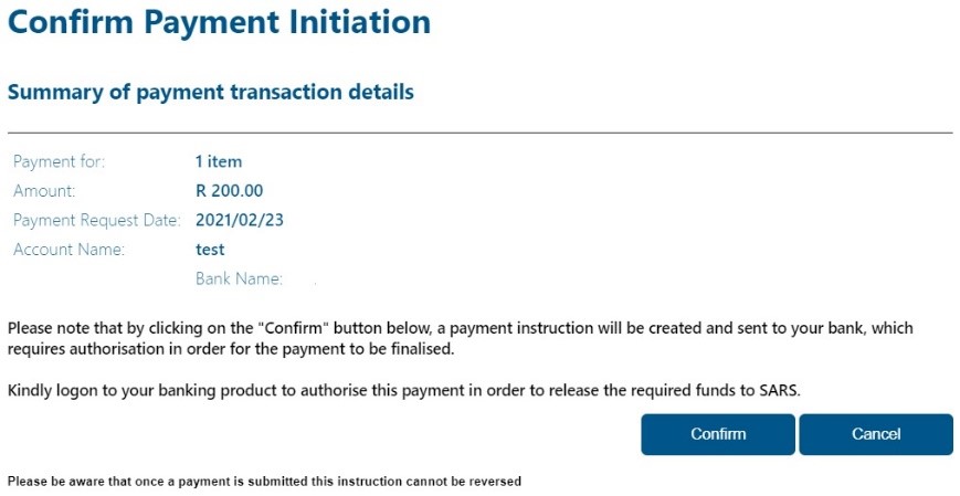 Select ‘Pay Now’ and then the ‘Confirm Payment Initiation’ page will be displayed. Please check that the details you have captured are correct. Click ‘Confirm’ to continue. Selecting ‘Cancel’ will cancel the transaction.