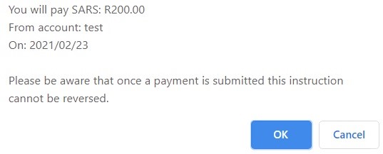 With an eFiling payment, the payment can be initiated by any eFiler, e.g. the taxpayer, tax practitioner, representative, but this payment must be approved by the bank account holder. When making a payment to SARS, eFiling will send a payment request to your bank which will indicate the amount that needs to be approved and gives a payment reference number. The bank account holder must then log on to his/her bank product and authorise this request, which acts as an instruction to the bank to make the payment to SARS.