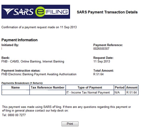 Your Payment Reference 0012345678 for R xxx on the SARS eFiling system is scheduled on…..
