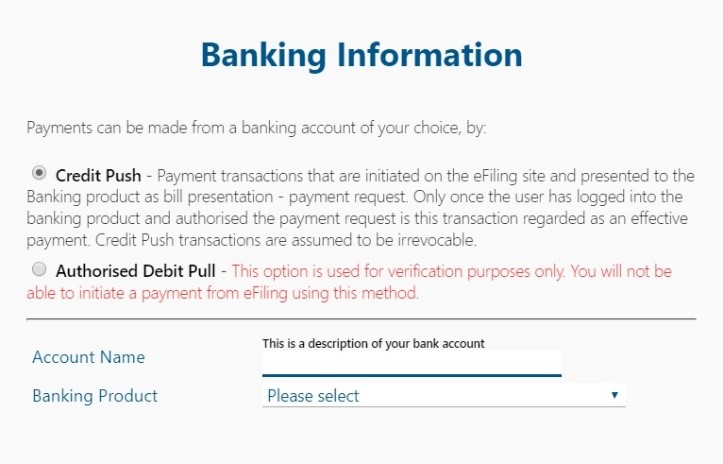 Once the payment has been processed on eFiling you will need to log onto your banking product and authorise the transaction.