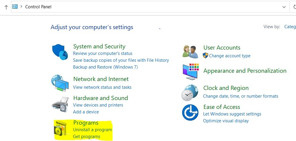 1. Go to ‘Control Panel’ on your machine and click ‘Uninstall a program’ as highlighted in yellow: