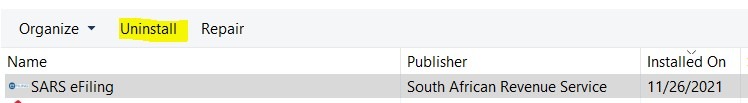 2. Select ‘SARS eFiling’ and click ‘Uninstall’: