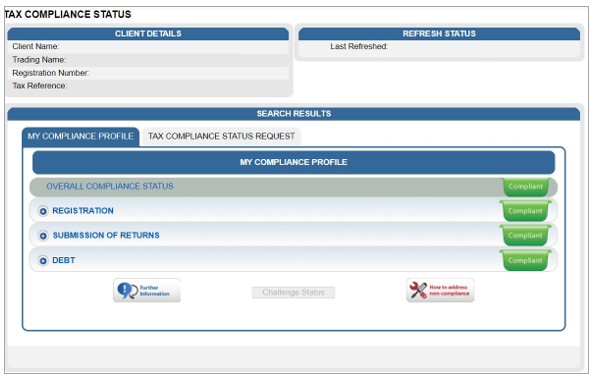 Your Overall Tax Compliance Status is a consolidated result of the individual requirements and any other business rules applied. A colour-coded profile will appear to indicate whether you are tax compliant or not.