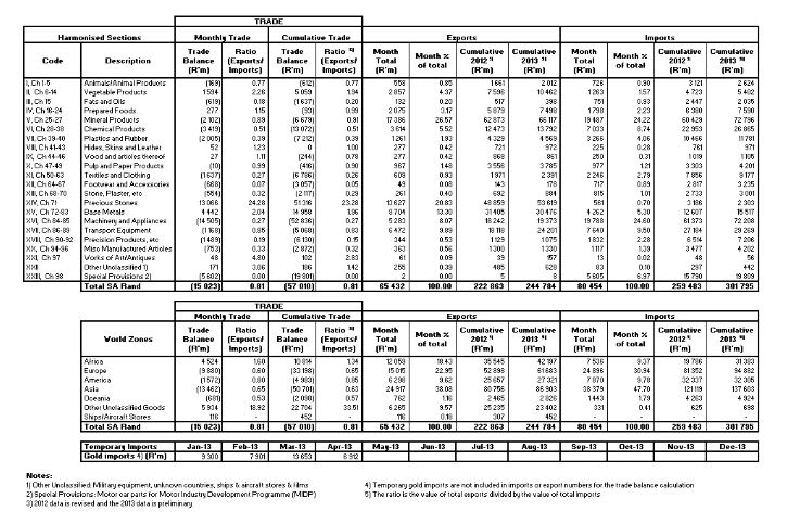 - Africa: The surplus increased from R3.14 bn in March 2013 to R4.52 bn in April 2013. Exports increased by R1.16 bn to R12.06 bn and imports decreased by R0.22 bn to R7.54 bn.