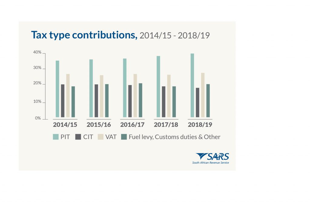 The main sources of revenue that contributed to the R1 287.6 billion collected were Personal Income Tax (PIT), which contributed R493.8 billion (38.3%), Value-Added Tax (VAT) contributing R324.6 billion (25.2%), Company Income Tax (CIT), which contributed R214.7 billion (16.7%) and Customs duties contributed R55.2 billion (4.3%).