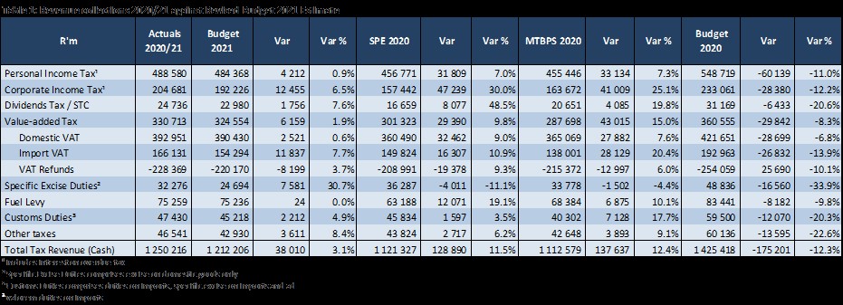 • Net PIT collections (including Interest on overdue taxes) were R4.2 billion (0.9%) higher than the RE, mainly due to higher PAYE and PIT provisional payments offset by higher refunds. PIT provisional payments were R1.7 billion (6.8%) higher than the RE. PAYE were higher than the RE by R6.5 billion (1.3%) offset by higher-than-expected PIT refunds of R2.7 billion (8.3%).• Net CIT collections (including Interest on overdue taxes) amounted to R204.7 billion, yielding a positive performance of R12.5 billion (6.5%) against the RE. This was as CIT provisional tax payments during the high collection month of February 2021 recorded a positive variance of R6.9 billion (27.0%), following the exceptional performance of SMME’s. The month of March 2021 also saw positive gains of R6.8 billion (38.2%) on the back of significant Paragraph 19(3) collections.• CIT refunds were also lower-than-expected by R0.9 billion (4.0%) against the RE as a result of lower CIT refunds paid out to the large business segment, particularly to the Mining sector.• Domestic VAT was R2.5 billion (0.6%) above the RE. Collections were boosted by the rebound in households’ real final consumption expenditure (FCE) in Q3-2020 as the lockdown restrictions were eased and the economy began a recovery path. FCE by households grew by a revised 75.3% q/q in Q3-2020 following the sharp contraction of 52.0% q/q in Q2-2020 from no growth in Q1-2020. FCE grew by 7.5% q/q in Q4-2020.• DT/STC collections amounted to R24.7 billion, yielding a slight increase of 7.6% against the RE. The heightened uncertainty in the economy has drastically affected the dividend distributions by companies. Companies maintained reserves and opted to suspend, defer or cancel dividend payments to their shareholders following the COVID-19 pandemic. Furthermore, the SA Reserve Bank urged commercial banks to freeze the payment of ordinary dividends or bonuses to executives this year. The COVID-19 pandemic forced companies to reassess their financial projections amidst the rapidly shifting landscape of the global economy.• Import VAT exceeded the RE by R11.8 billion (7.7%). However, collections were R13.9 billion (7.7%) less than prior year mainly due to declining growth rates from the largest commodity drivers of the tax; underpinned by the overall annual value of merchandise imports contracting by 12.6% for the period April 2020 to February 2021.• Customs Duties exceeded the RE by R2.2 billion (4.9%). However, collections were R8.0 billion (14.4%) less than prior year mainly due to declining growth rates from the largest commodity drivers of the tax; underpinned by the overall annual value of merchandise imports contracting by 12.6% for the period April 2020 to February 2021.• Specific Excise duty collections were R7.6 billion (30.7%) higher than the RE mainly due to higher cigarettes and wine sales; and R14.6 billion (-31.1%) less than prior year.• Fuel levies were slightly (0.03%) higher than the RE; and R4.9 billion (-6.1%) less than prior year mainly due to less fuel sales by local manufacturers.